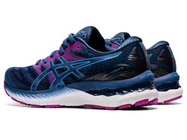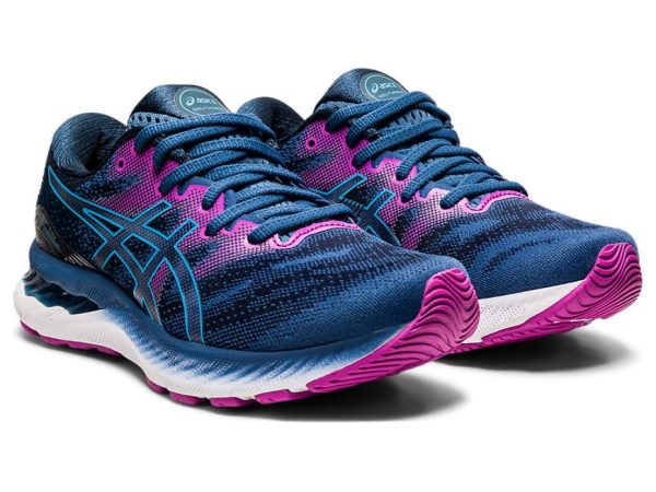 The GEL-NIMBUS® 23 running shoe continues to offer excellent comfort and long-run impact absorption. Its improved stability provides a more balanced stride that’s followed by smoother transitions. Constructed with comfort and breathability in mind, the upper features a softer engineered mesh design for long runs. Engineered eyelet shaping helps the upper move more naturally with the foot, while a stretchy midfoot panel appropriately hugs the foot to generate better flexibility. Additionally, the shoe’s upper is made with recycled materials to reduce waste and carbon emissions. Providing the runner with excellent shock absorption and softness, the GEL-NIMBUS® 23 delivers more compression in the heel thanks to its softer GEL® technology cushioning unit and contoured design lines. Also, a gender-specific TRUSSTIC™ device provides an articulated amount of support in the right direction for men and women to help generate a smooth transition. Under the toe, the inclusion of gender-specific pillars help cushion the body and help runners experience a softer feel. Simultaneously, the OrthoLite™ X-55 sockliner equips runners with a forgiving, yet responsive stride. The components of the GEL-NIMBUS® 23 shoe help increase the softness without forgoing the integrity of the shoe’s ride. Our 23rd version of the GEL-NIMBUS® continues to make advancements within the lineage by offering improved support and comfort for distance runners.